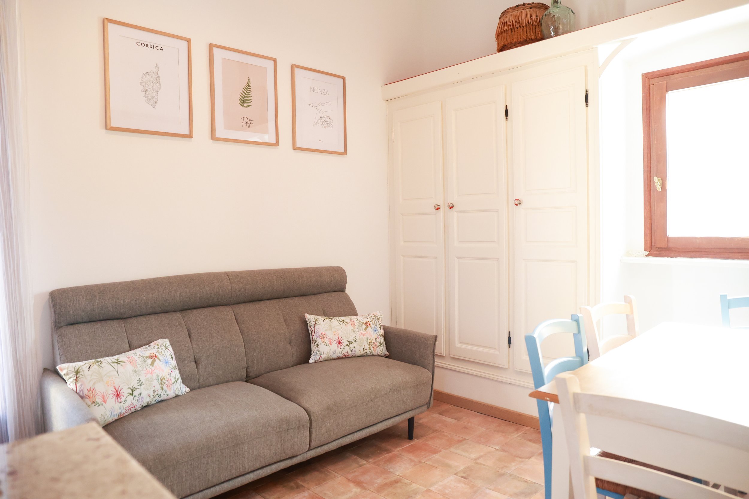 L’espace de vie s’ouvre vers l’extérieur sur une terrasse d’environ 20 m², ombragée en saison par un mûrier blanc, créant un véritable espace de vie supplémentaire tourné vers la végétation et le terrain.